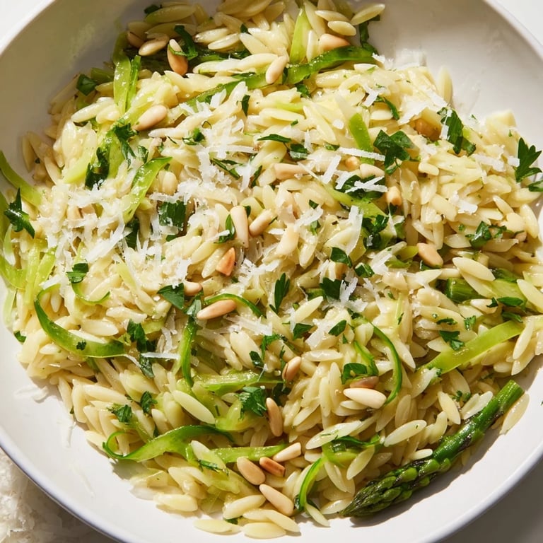 Add grilled chicken breast for protein and substance, or stir in cooked chickpeas for a vegetarian boost. Both options complement the bright lemon dressing without overpowering the delicate asparagus and orzo.