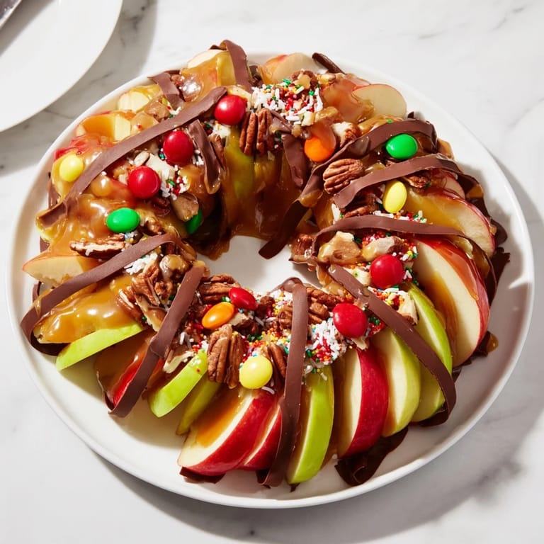 Save A festive and visually stunning dessert featuring crisp apple slices drizzled with gooey caramel and chocolate, topped with holiday-inspired decorations. Perfect for Christmas gatherings!