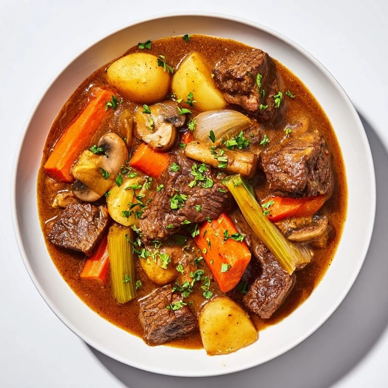 - For the Beef Stew: 2 lbs (900 g) beef chuck cut into 1½-inch cubes, 2 tbsp olive oil, 1 large yellow onion diced, 3 cloves garlic minced, 3 medium carrots peeled and cut into 1-inch chunks, 2 parsnips peeled and cut into 1-inch chunks, 2 celery stalks sliced, 8 oz (225 g) cremini or button mushrooms quartered, 2 tbsp tomato paste, 1 cup (240 ml) dry red wine, 4 cups (1 L) beef broth, 2 bay leaves, 1 tsp dried thyme, 1 tsp dried rosemary, 2 tsp smoked paprika, 1½ tsp kosher salt (plus more to taste), ½ tsp black pepper, 2 medium Yukon Gold potatoes cut into 1-inch pieces, 1 tbsp Worcestershire sauce, 1 tbsp cornstarch mixed with 2 tbsp cold water (optional for thickening), ¼ cup fresh parsley chopped (for garnish)