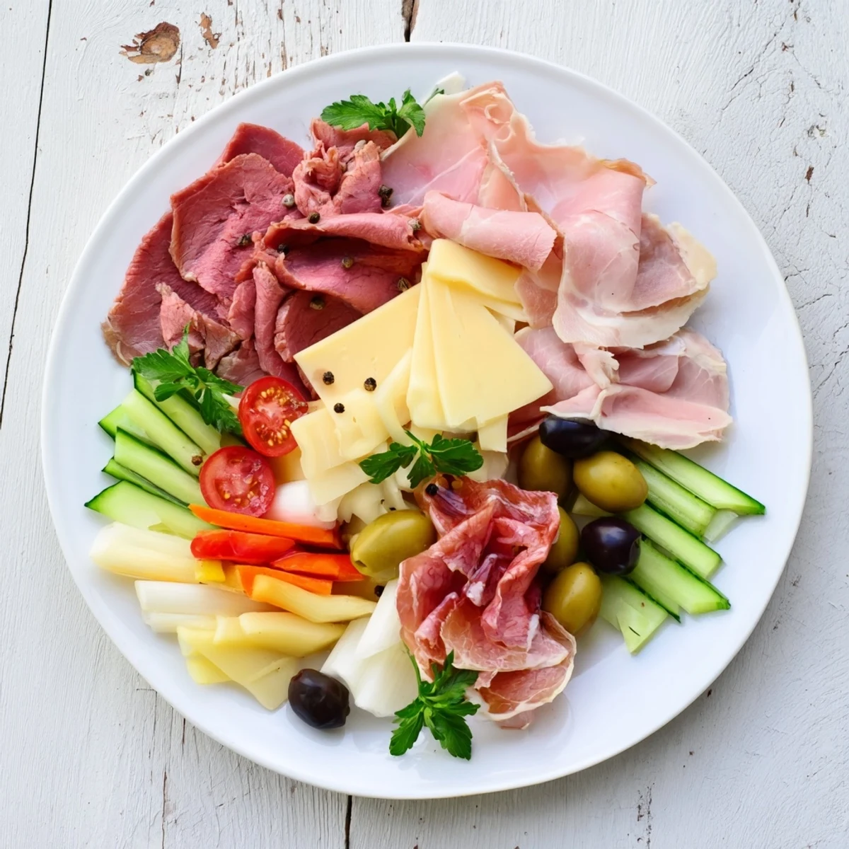 The plate features sliced roast beef, smoked turkey, prosciutto, and salami, offering a variety of flavors and textures.