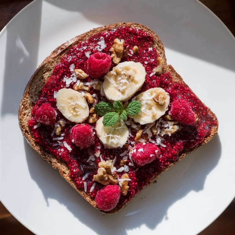 Save There's something almost magical about the way raspberries collapse into a glossy, jewel-toned jam in just minutes—no long simmering required. I discovered this particular toast combination on a lazy Sunday when I had a handful of berries getting soft in the fridge and a sudden craving for something both nourishing and indulgent. The chia seeds were a happy accident, really, a way to thicken the jam without added sugar, and the whole thing came together so naturally that I've made it dozens of times since.