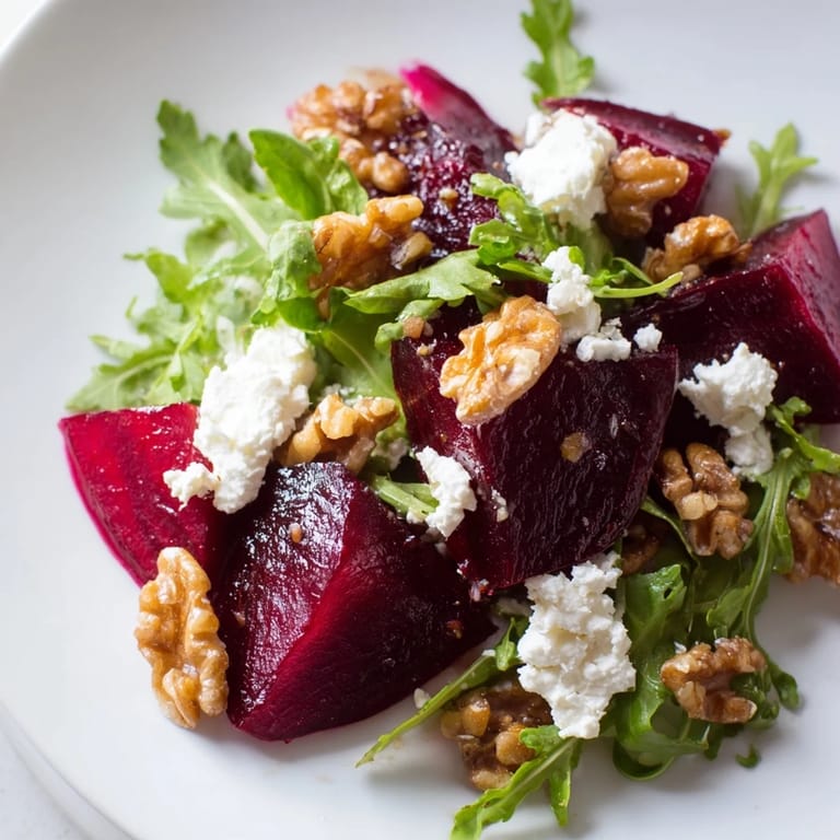 Save There's a particular Tuesday afternoon I won't forget—I was standing in a farmers market aisle, drawn to a pile of beets so deep crimson they looked almost unreal. The vendor mentioned they were perfect for roasting, and something about the way the afternoon light hit them made me want to build an entire meal around them. That night, I tossed them in foil, set them in the oven, and while the kitchen filled with this earthy, almost mysterious smell, I realized I was making something I'd never made before. It turned into this salad—tangy, bright, with pockets of creamy cheese and walnuts that crack between your teeth.