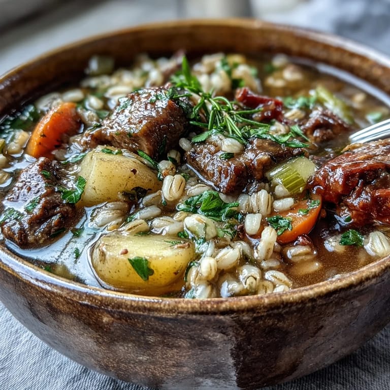 Save The first snow of winter was falling outside as I stirred this beef and barley soup, watching steam rise from the pot like memories. My kitchen window framed the gentle flurries while the rich aroma of simmering beef and mushrooms wrapped around me like a familiar blanket. The rhythmic chopping of vegetables that afternoon became a meditation, each slice promising comfort in the bowl to come. Something about the earthy scent of barley plumping in broth brings me back to center when life feels chaotic.